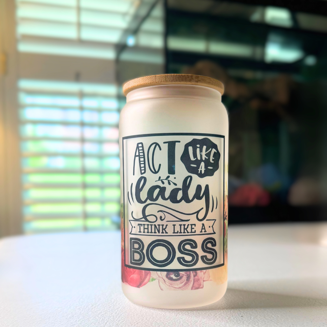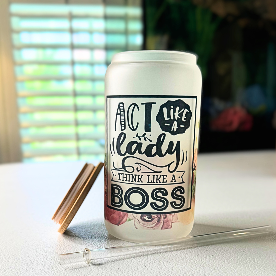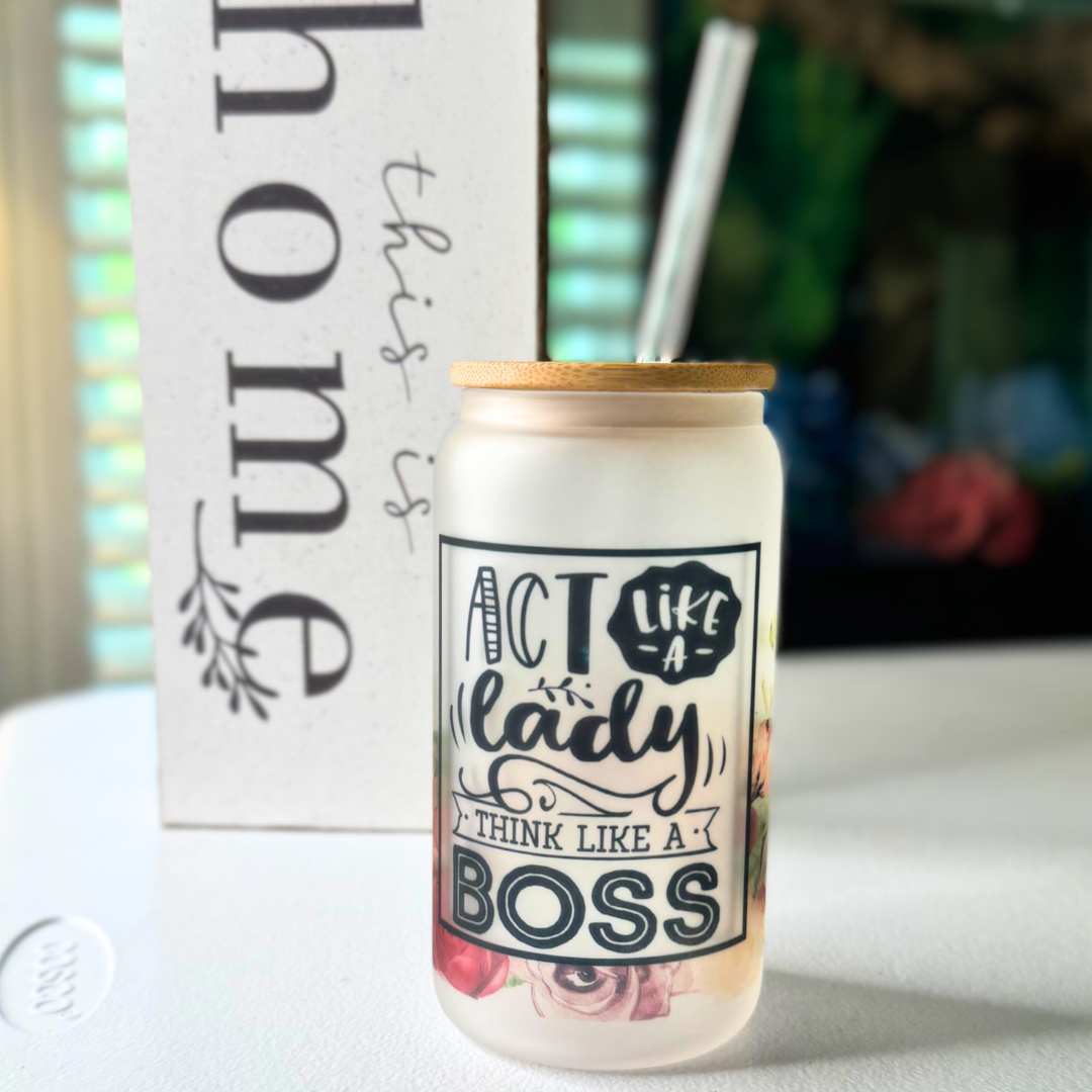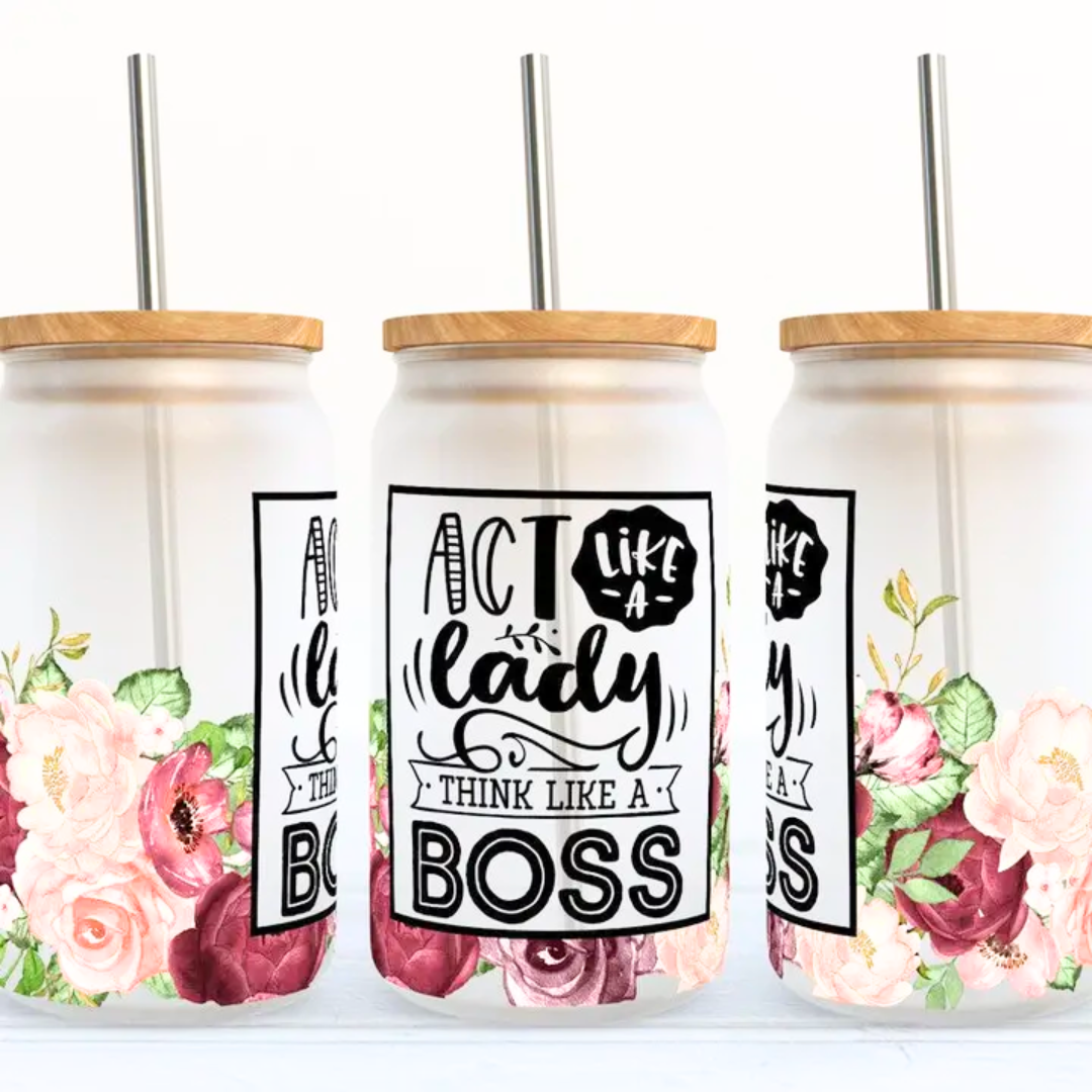 Indulge in your favorite cold beverage with our sophisticated 16oz Frosted Libby Glass Tumbler - Lady Boss. Perfect for your iced coffee, water, or your favorite cold beverage. Handmade with premium Libbey glass and with sublimation images that won't peel, this tumbler features vibrant flowers in dark red and pink with the words 'Act Like A Lady, Think Like A Boss'. Perfect for gifting or treating yourself, elevate your drink experience with our elegant tumbler.