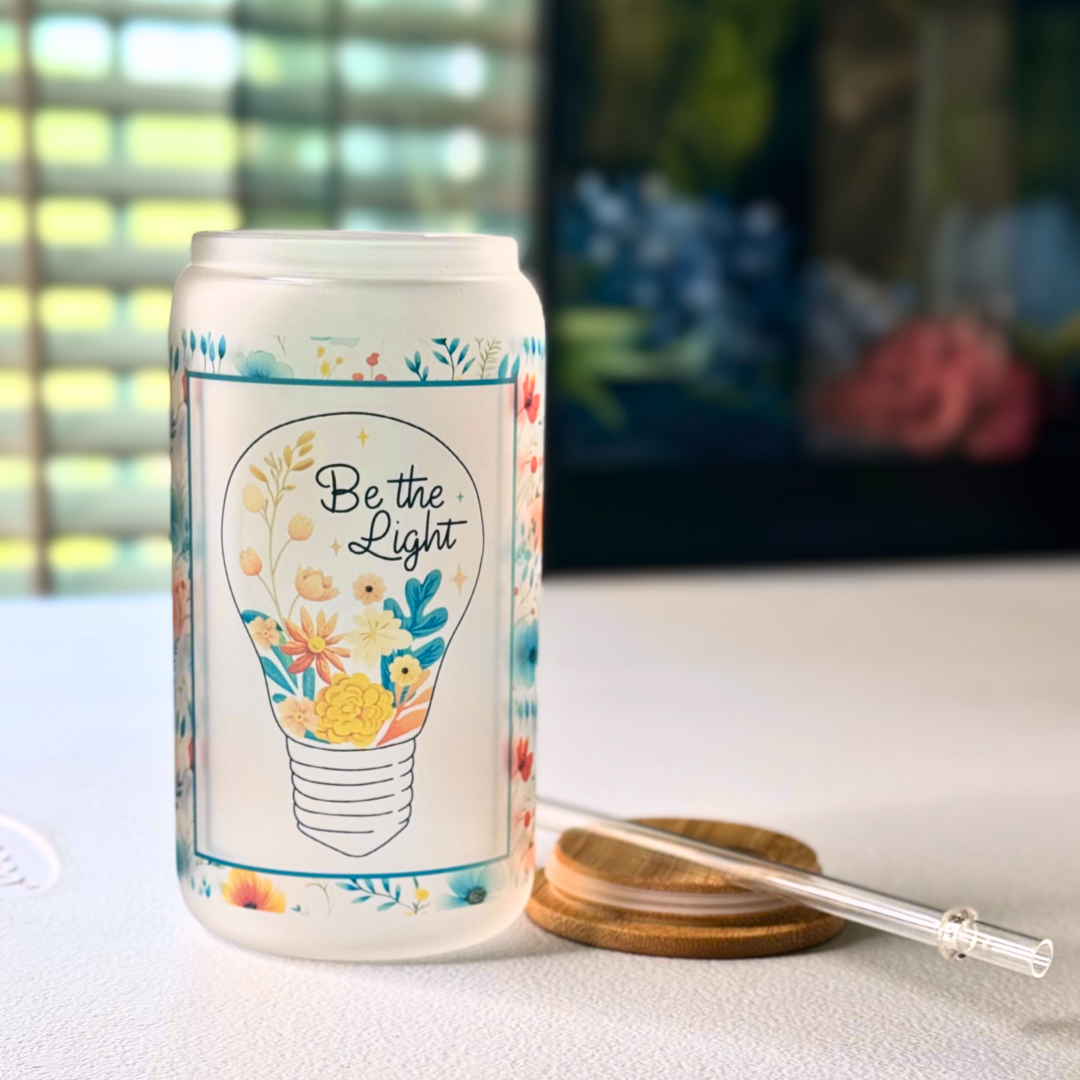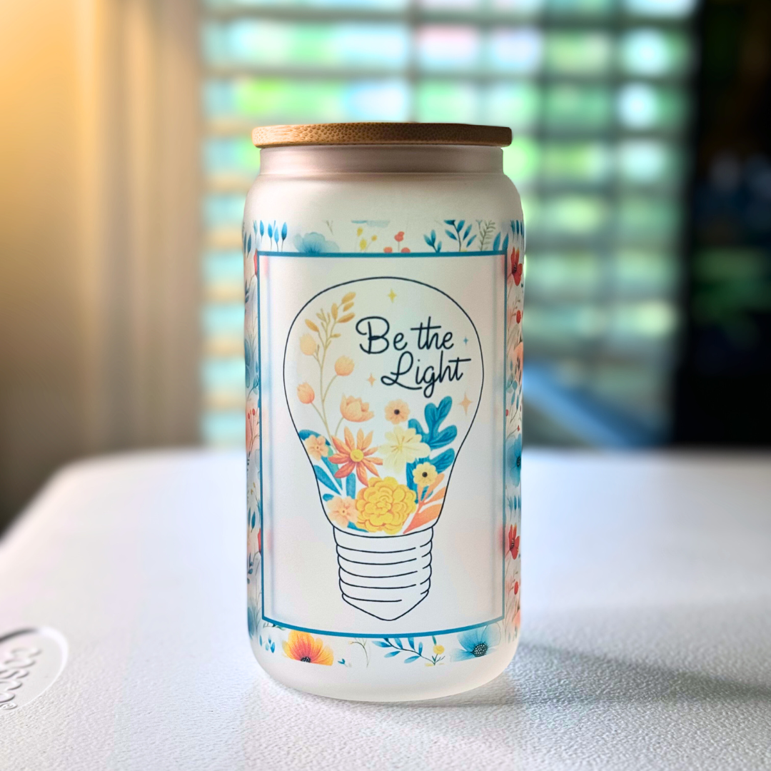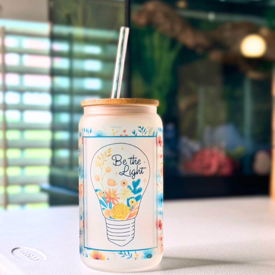 Indulge in a touch of sophistication with our 16oz Frosted Glass Tumbler. Crafted from premium Libbey Glass, this tumbler is perfect for your iced coffee, water, or any cold beverage. Adorned with a vibrant floral pattern and inspiring words, 'Be The Light', it's a true work of art. Gift one to yourself or a loved one for a luxurious and thoughtful treat.
