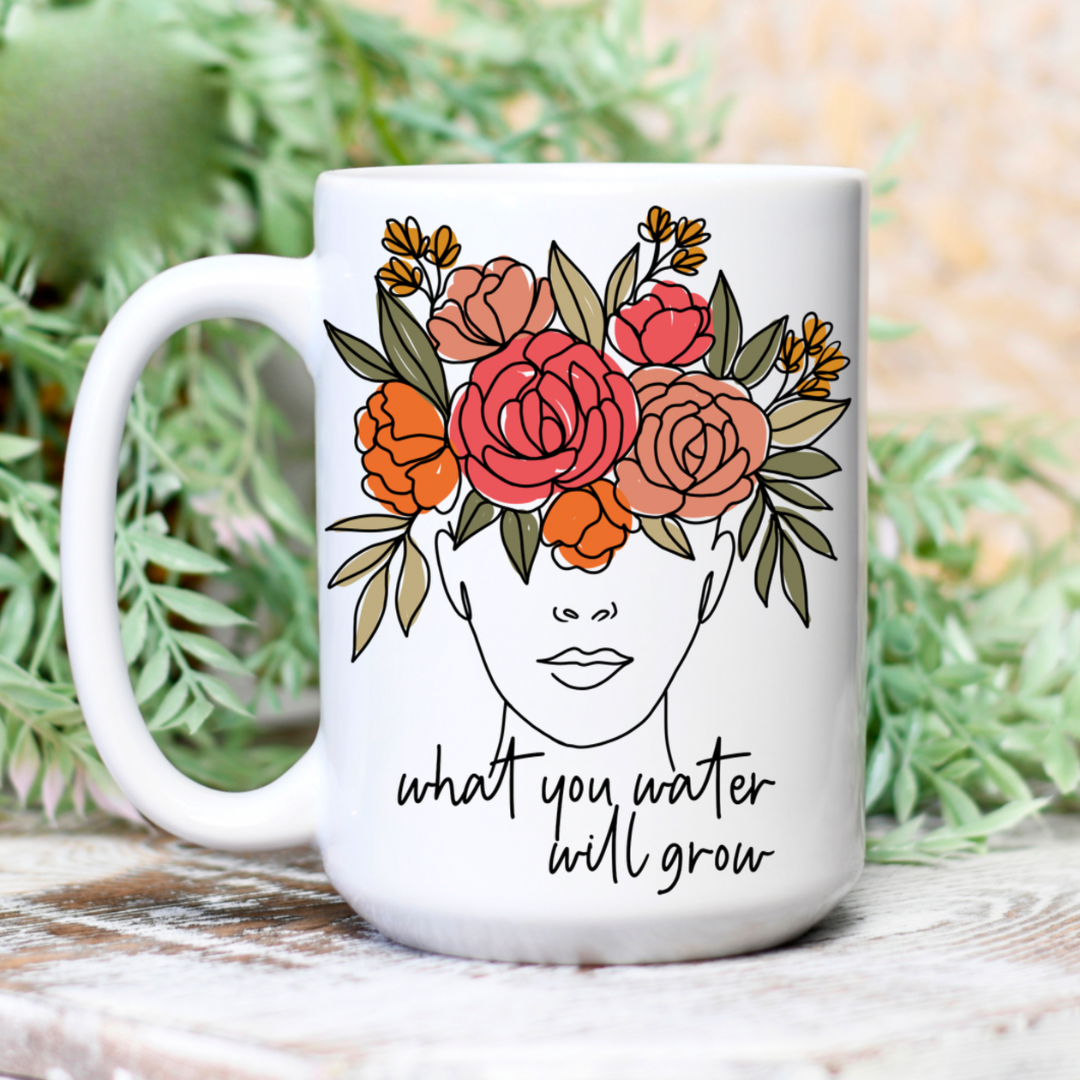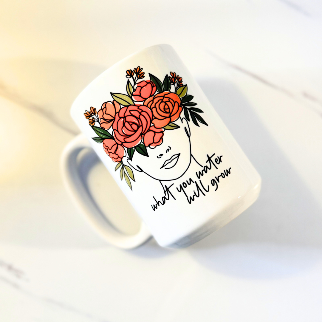 Introducing our exquisite 15oz white ceramic mug, adorned with a stunning design on one side. Crafted with premium sublimation, these intricately detailed designs are built to withstand time and proper care. Envision an elegant woman, adorned with vibrant flowers blooming from her head, while the words "what you water will grow" serve as a reminder of the beauty of nurturing growth. Indulge in this luxurious and exclusive mug, where art and function come together in perfect harmony.
